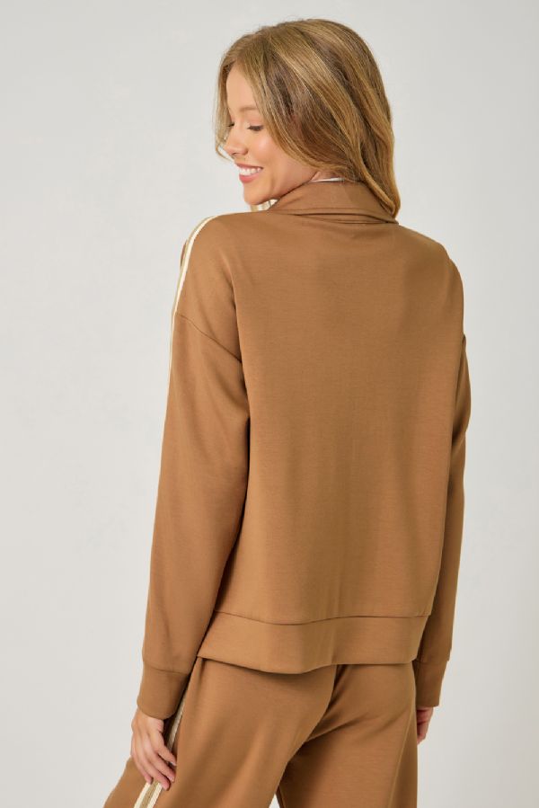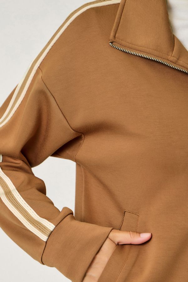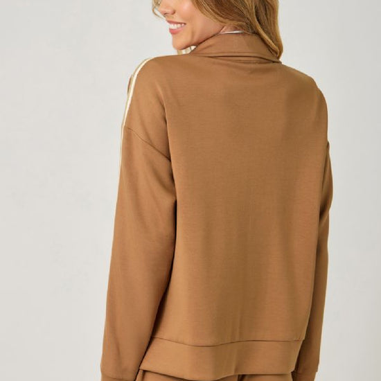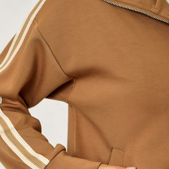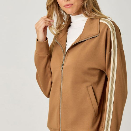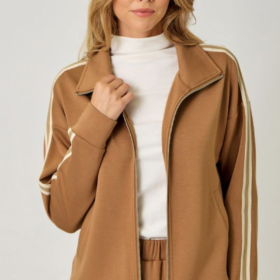 The perfect blend of cozy and polished, the Caramel Comfort Lounge Zip Jacket brings everyday elegance to your laid-back style. Designed in a warm caramel hue with soft cream stripes along the sleeves, this zip-up offers that effortless vintage-inspired charm we love. The smooth, midweight fabric feels luxuriously soft, while the relaxed silhouette and classic collar make it endlessly versatile, ideal for layering through every season.