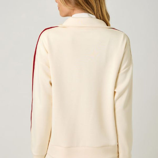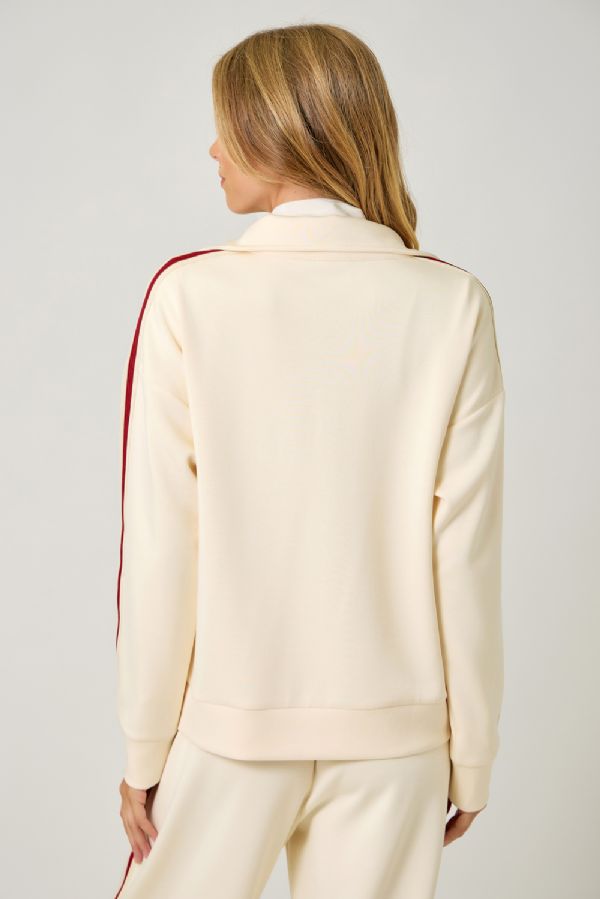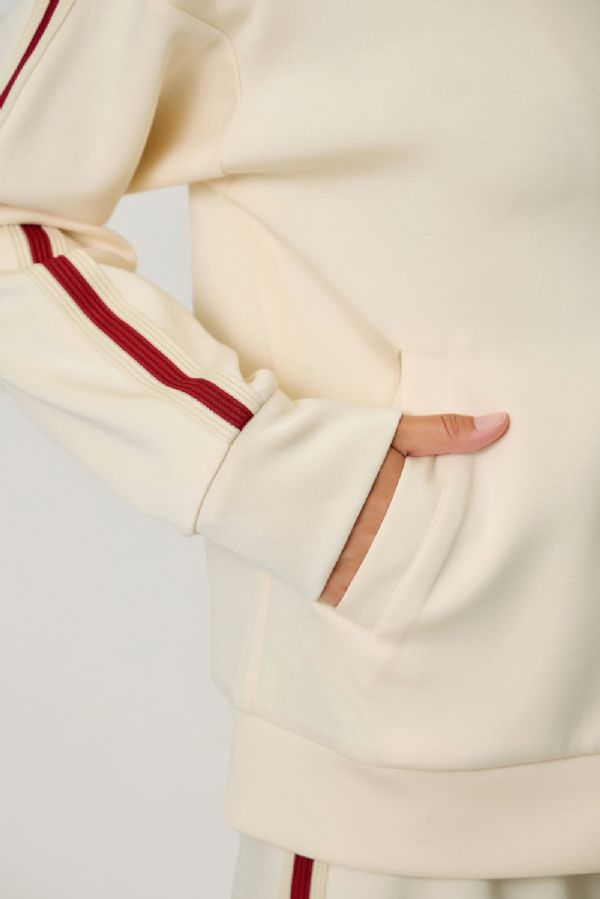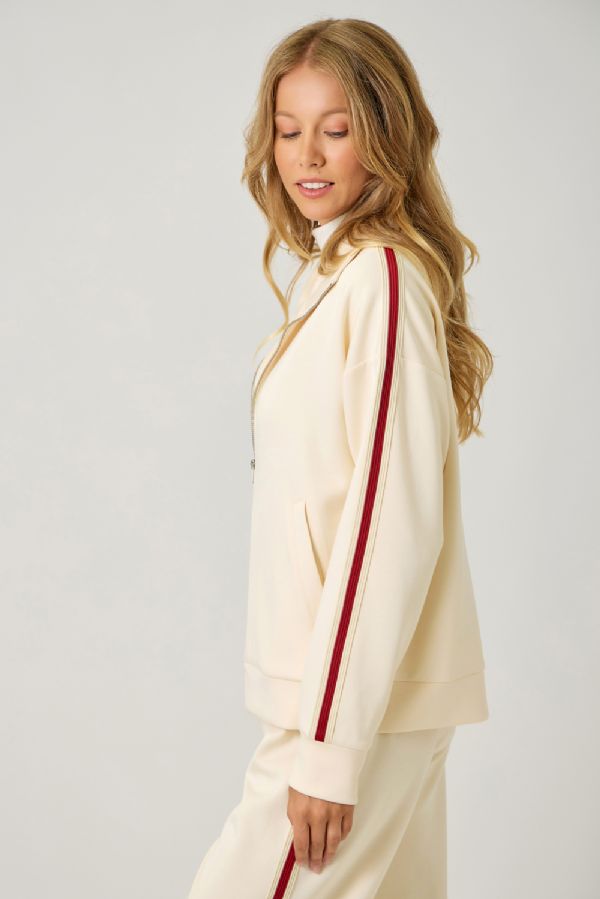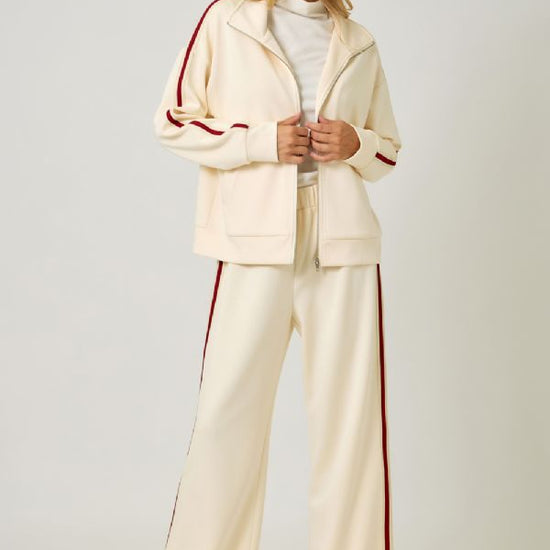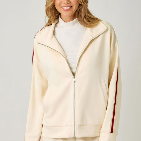 Sleek, soft, and effortlessly timeless, the Cream & Crimson Lounge Zip Jacket brings everyday comfort with a touch of retro flair. Designed in a creamy neutral tone with bold crimson stripes along the sleeves, this zip-up offers a relaxed yet refined look you'll reach for again and again. Its smooth, mid-weight fabric drapes beautifully while the classic collar and side pockets add functional charm. Perfect for layering over your favorite tees, tanks, or knits, it's the ultimate mix of comfort and polish.
