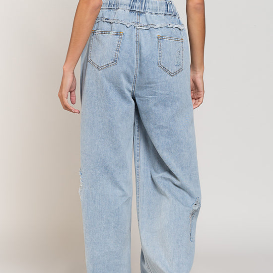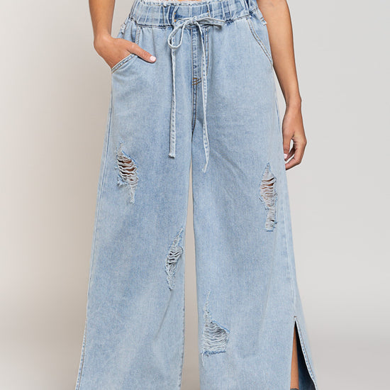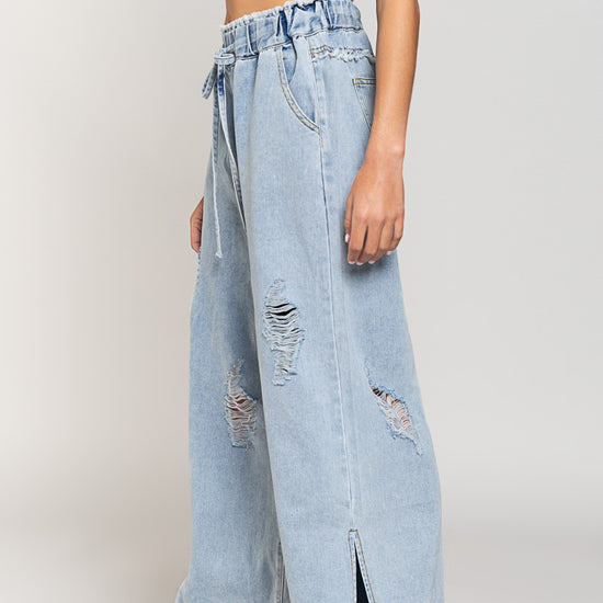 Crafted with wide legs for a modern silhouette, the Distressed Denim Pants by POL Clothing combine style and comfort. The elastic waistband with a tunneled drawstring tie ensures a customizable fit, while side bottom slits provide added movement and a subtle design detail. These pants balance practicality with a fashion-forward edge. Ideal for those who appreciate expert tailoring in casual wear.