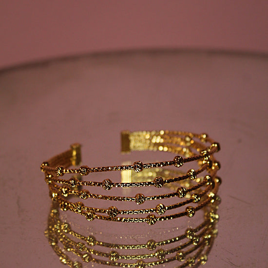 The Aurora Cuff is expertly crafted with a 14k gold-dipped finish, combining durability with luxurious shine. Featuring five slender strands that elegantly wrap the wrist, this cuff offers a sophisticated yet modern aesthetic. Its lightweight design ensures comfort for daily wear, while the high-quality gold dipping provides lasting brilliance. Ideal for layering or as a statement piece, this cuff exemplifies refined craftsmanship and timeless style.