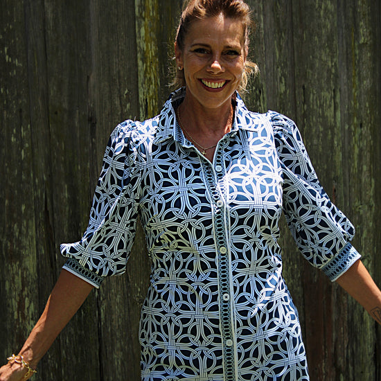 The Gretchen Scott Swagger Dress Ring Toss features a flattering 36" total length with elegant puff sleeves finished by coordinating fabric cuffs. Designed for comfort and style, it includes side seam pockets and shiny shell buttons for a polished look. The dress is accented with coordinating fabric on the inside back panel, outside collar placket, and front placket, adding subtle sophistication. An optional 4" wide belt, 60" long, allows you to customize your silhouette, while the 4" hand hem ensures a refined finish. Perfect for making a confident statement wherever you go.