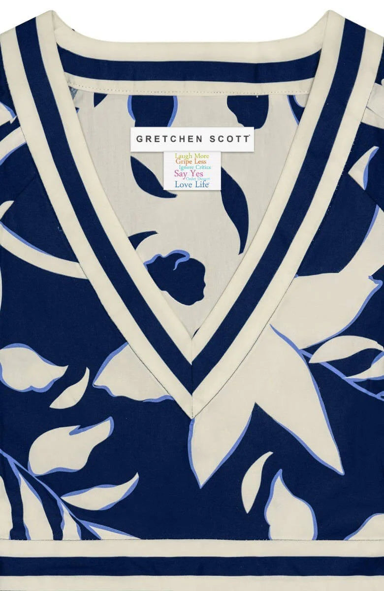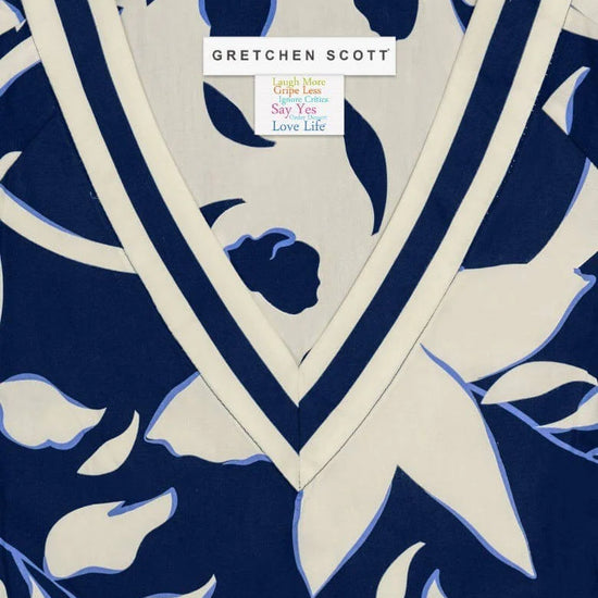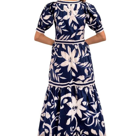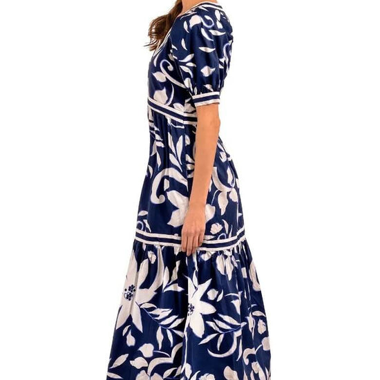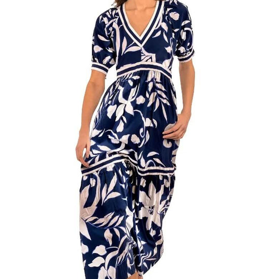 The Gretchen Scott Viviers Dress in Navy is expertly crafted with a 49" length and an empire waist that enhances your silhouette. It features 1.5” racer stripe banding at the V-neck, puff sleeves, and a tiered gathered skirt for a refined, feminine look. Six pleats at the back provide subtle structure, while a 15” invisible side seam zipper ensures a seamless fit. Practical side seam pockets and a contrast inside back panel add thoughtful details, finished with a delicate 4” hand hem for polished elegance.
