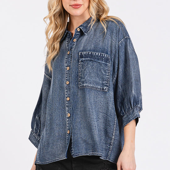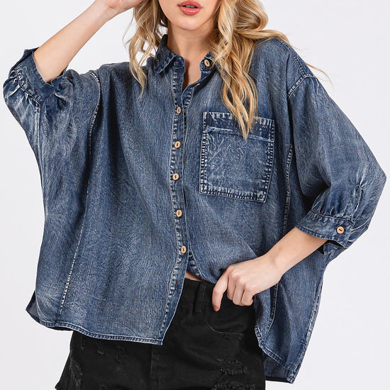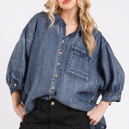 Effortlessly cool with a touch of vintage charm, the Harper Mineral Wash Denim Blouse is your new go-to for laid-back style. Designed with a relaxed, oversized fit and crafted from soft, mineral-washed denim, this button-front top offers all-day comfort with an elevated edge. The gathered back yoke and billowy 3/4 sleeves add a feminine twist, while the front pocket brings a casual, utility vibe. Perfect for layering or wearing solo; it's a piece you'll reach for in every season.