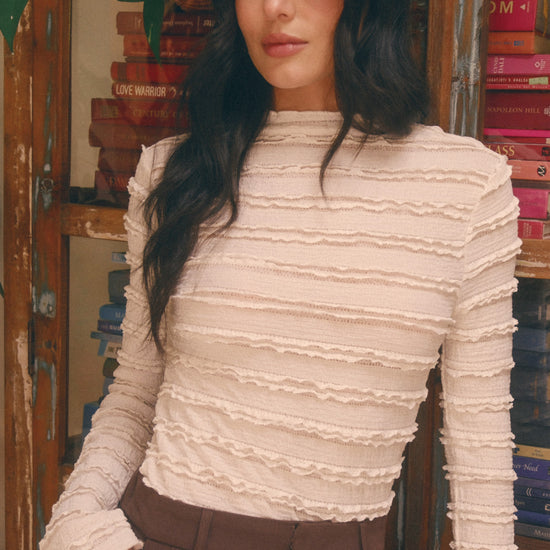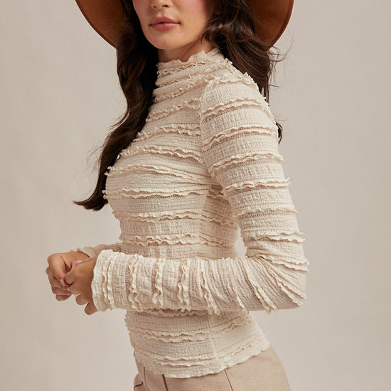Delicate and endlessly romantic, the Ivory Reverie Ruffle Lace Top brings classic elegance to your modern boho wardrobe. Featuring a soft mock neckline, long sleeves, and layers of ruffled lace texture, this ivory beauty exudes a sense of refinement and coziness. Its gentle stretch and flattering fit make it the perfect piece for elevating your everyday look or dressing up for a special occasion.