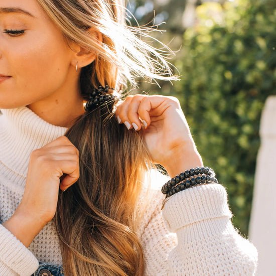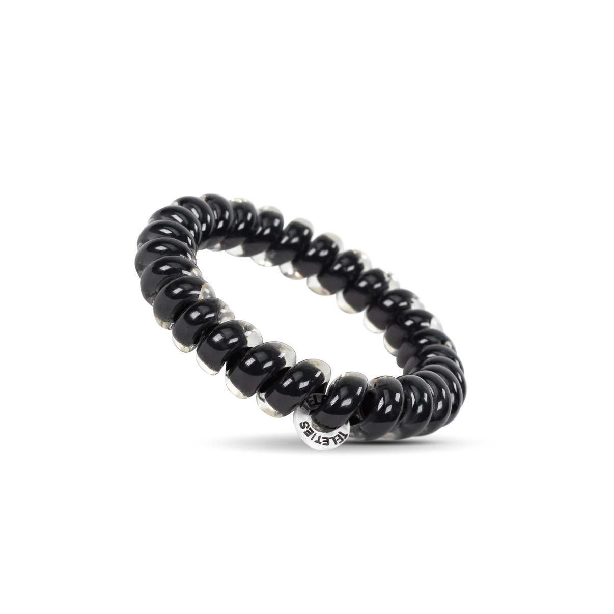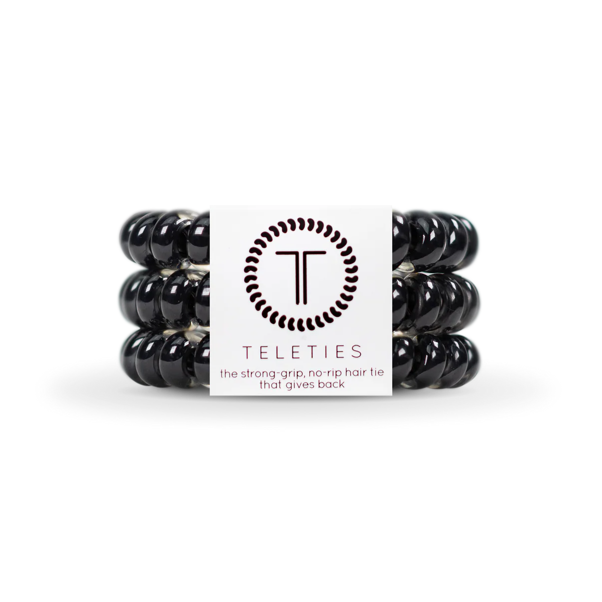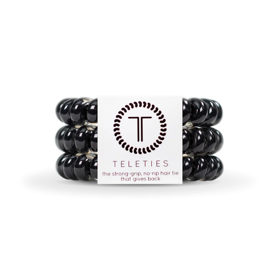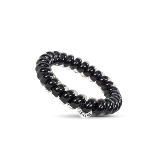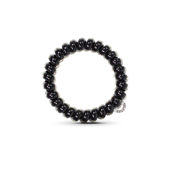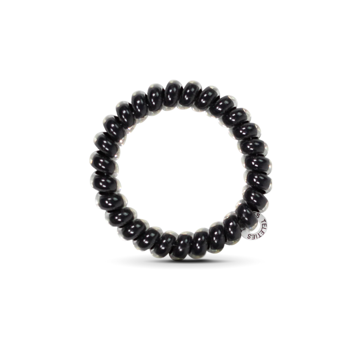 Teleties Jet Black Hair Tie offers a strong grip without damage and doubles as a chic wrist accessory when not in use. Your new favorite hair essential all year round. Pack of three