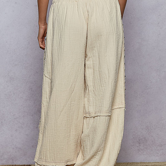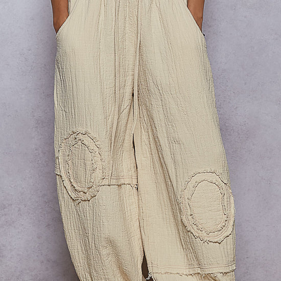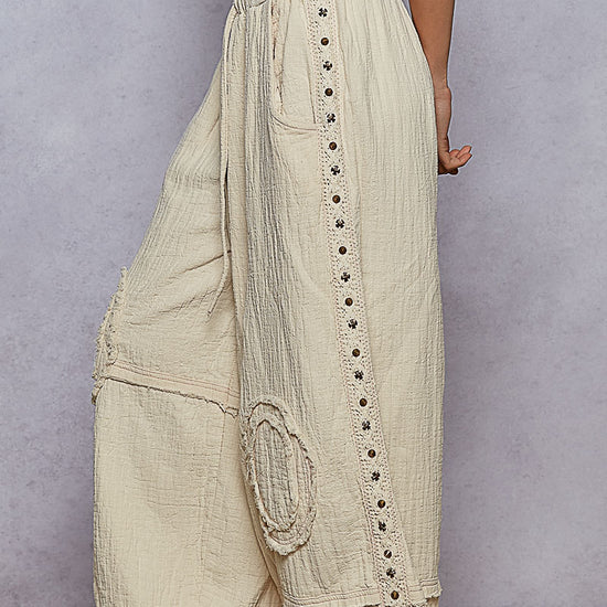 The Meadowlight Patch Gauze Pants, by POL Clothing, are a natural extension of everything we love about laid-back boho dressing, easy, artistic, and quietly bold. Made from breathable crinkled cotton gauze, these wide-leg pants feature hand-finished circular patchwork with soft raw-edging, antique brass eyelet trim, and a flowy silhouette that moves with you.