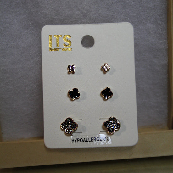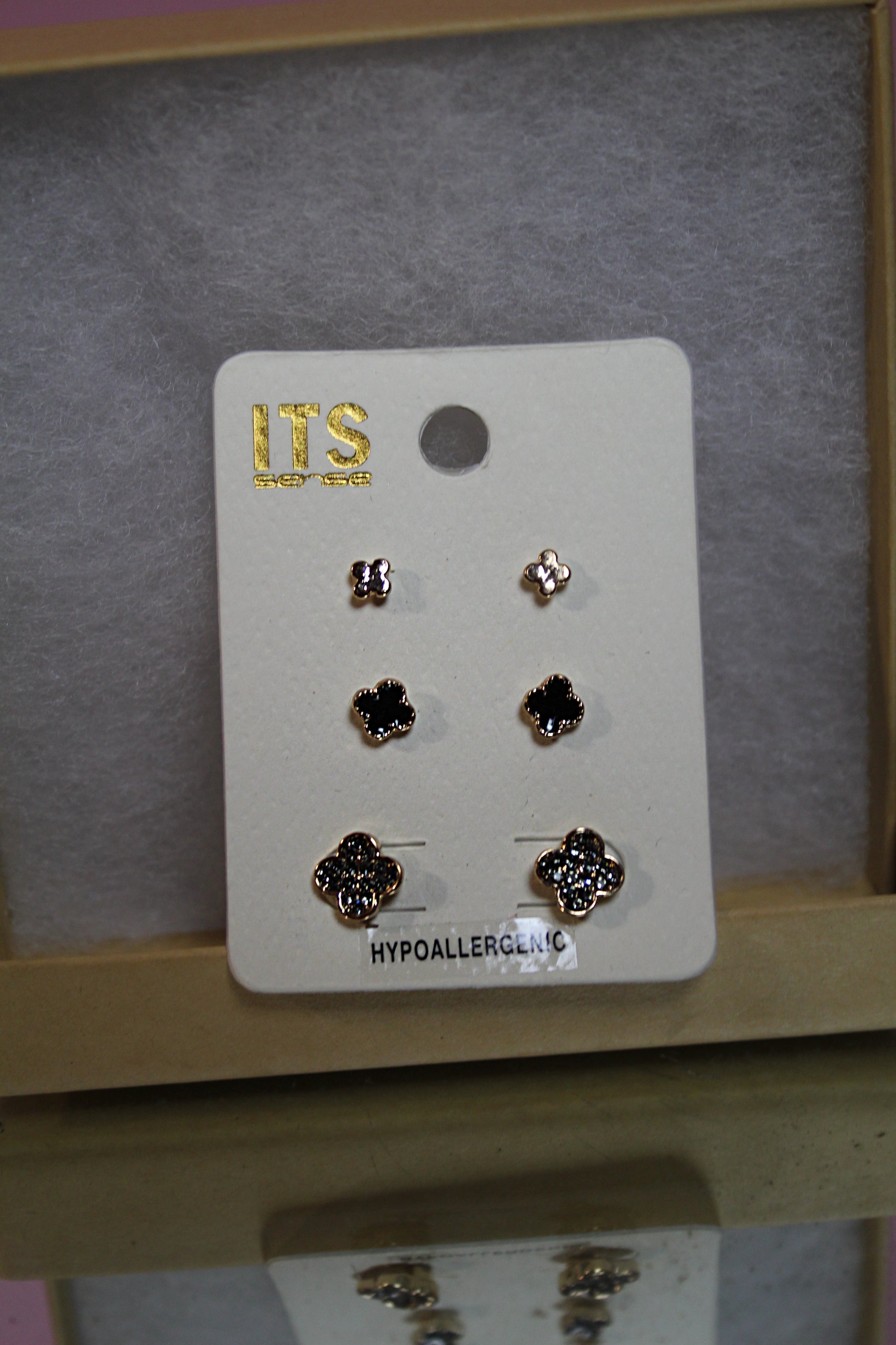 Elegant yet understated, the Midnight Bloom Earring Set features a trio of floral-inspired studs, from polished gold to glossy black to crystal-encrusted sparkle. These hypoallergenic beauties offer versatile sophistication that transitions effortlessly from day to night. A timeless essential for the modern muse.