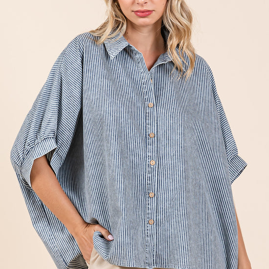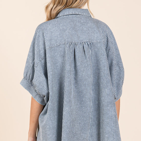 Breezy mornings and salt-kissed air call for the Cape Cod Chambray Top. This oversized navy and white striped top drapes effortlessly for that just-right slouchy fit, perfect for layering over your favorite tank or tossing on with jeans for a relaxed coastal vibe.