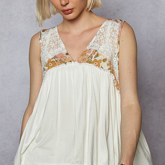 Elevate your wardrobe with The Juniper Bloom Top from POL Clothing, crafted from soft POL jersey for all-day comfort. Its flattering sleeveless design and A-line silhouette create a graceful shape, while the delicate lace trim with a pointed floral pattern adds a touch of feminine elegance. Perfect for effortless style.