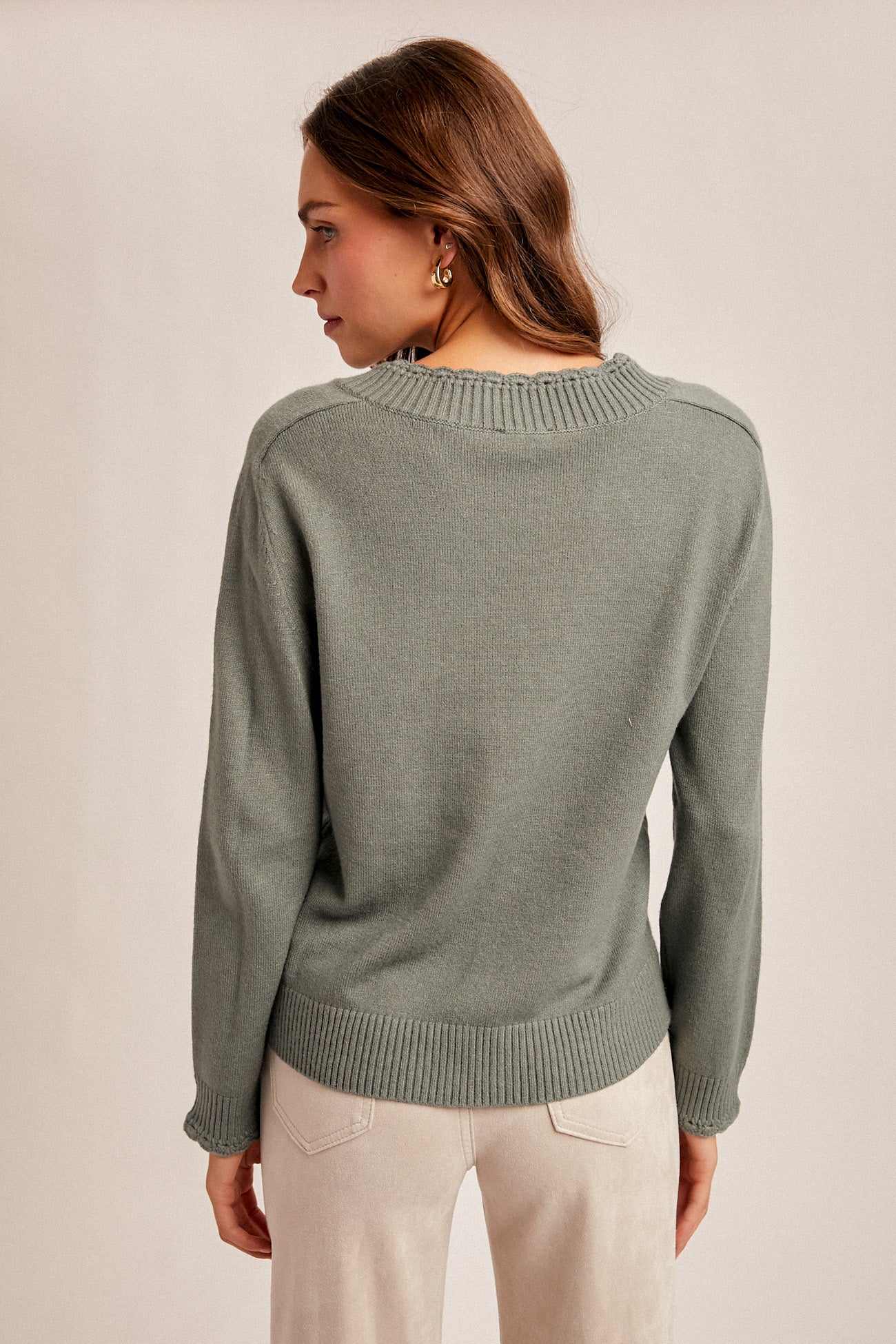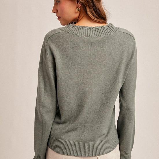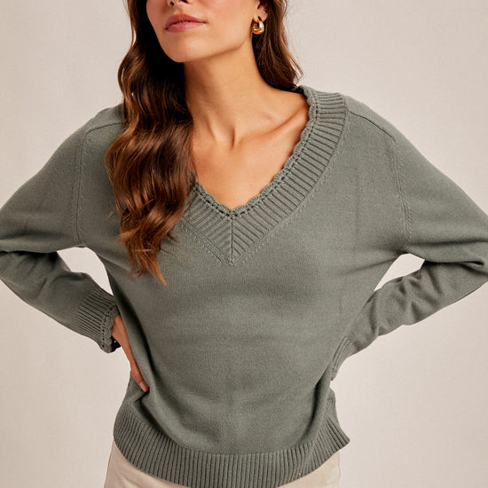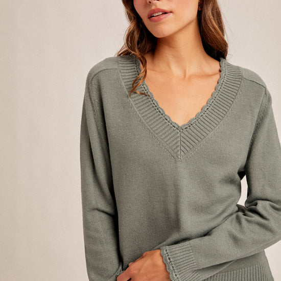Cozy meets feminine in the Sage Meadow Knit Sweater, from Hem & Thread. Crafted in a soft sage-green hue, this timeless knit features a scalloped V-neckline and delicate trim at the cuffs for a subtle, romantic touch. Its relaxed yet polished silhouette makes it a versatile go-to piece, whether you're dressing up or keeping it casual. Fits true to size.