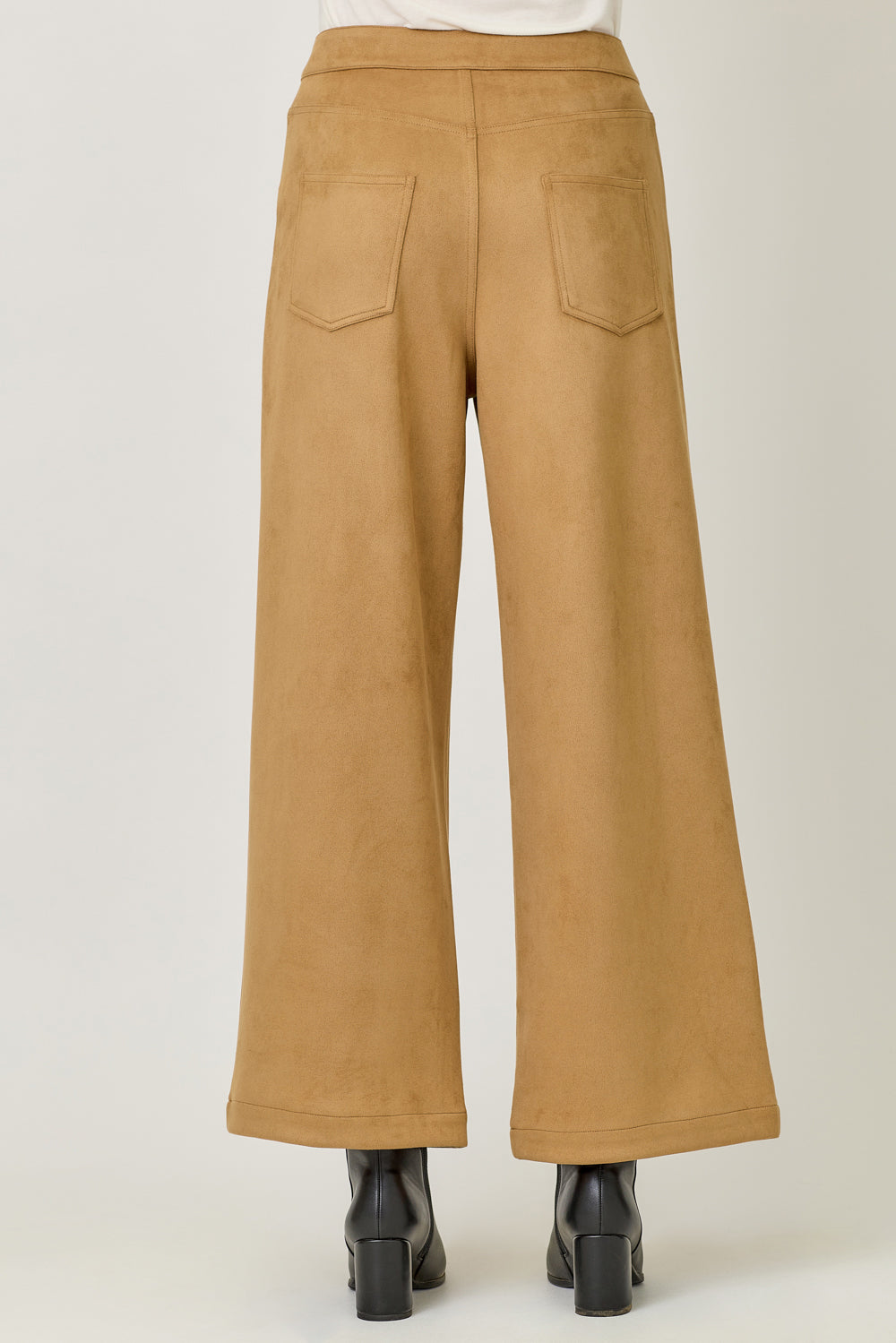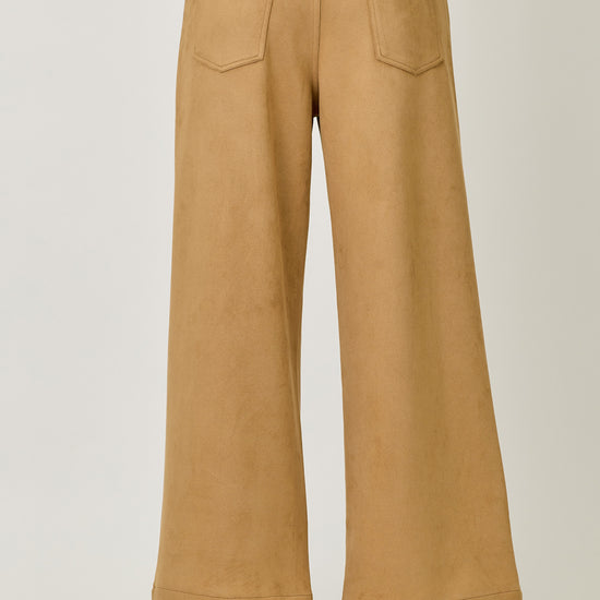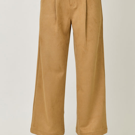 The warm latte hue is a cozy neutral that transitions seamlessly through seasons, while subtle front pleats and a wide-leg silhouette offer a flattering fit that's both modern and timeless. Designed with a clean waistband, deep side pockets, and a softly sueded feel, they pair effortlessly with everything from cozy knits to silky blouses.