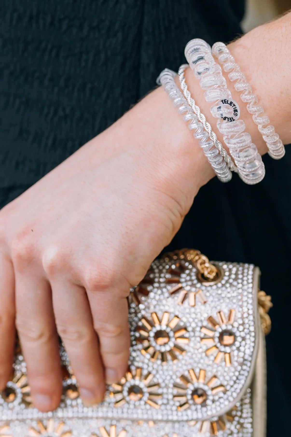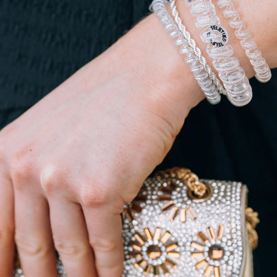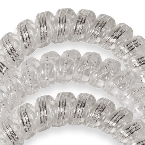 Hold your hair and enhance your style with Teleties Silver Hair Tie-- the strong grip, no-rip hair tie that doubles as a bracelet. Strong, pretty, and stylish Teleties are designed to withstand everyday demands while taking your look to the next level. Pack of three