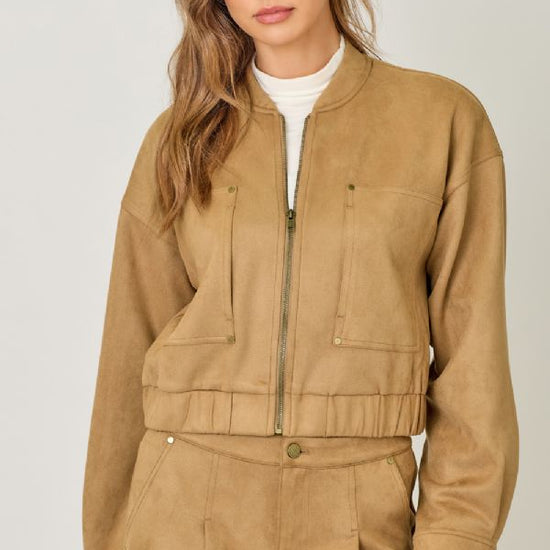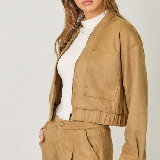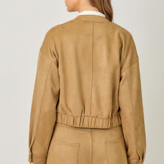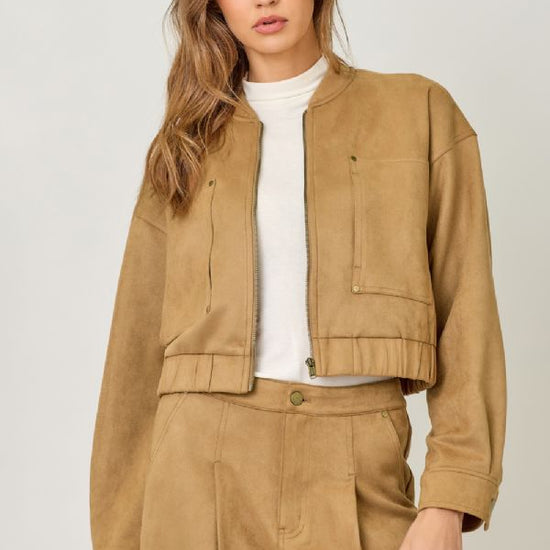 Polished, effortless, and endlessly wearable, the Sandstone Suede Bomber Jacket brings a refined take to a classic silhouette. Designed in a soft faux-suede finish with a rich latte hue, this cropped bomber features clean lines, minimal hardware, and subtle front pocket detailing for that just-right blend of structure and ease. The elasticized hem adds a flattering shape, while the lightweight feel makes it perfect for layering season after season. A modern staple that instantly elevates denim, basics, and everything in between.