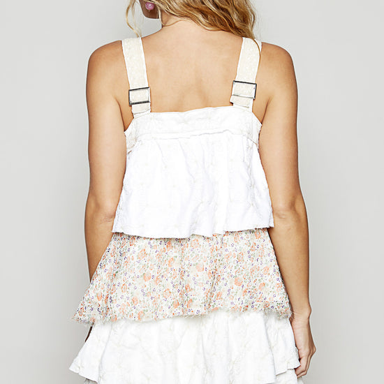 POL Clothing's Morgan Dress features embroidered twill fabric with a charming, printed patch and delicate raw-edge ruffle layers. Designed with trim straps and finished with vintage washing, it offers a refined yet relaxed look. Crafted from 100% cotton, it ensures breathability and comfort, making it an ideal choice for warm-weather wear with a touch of artisanal detail.