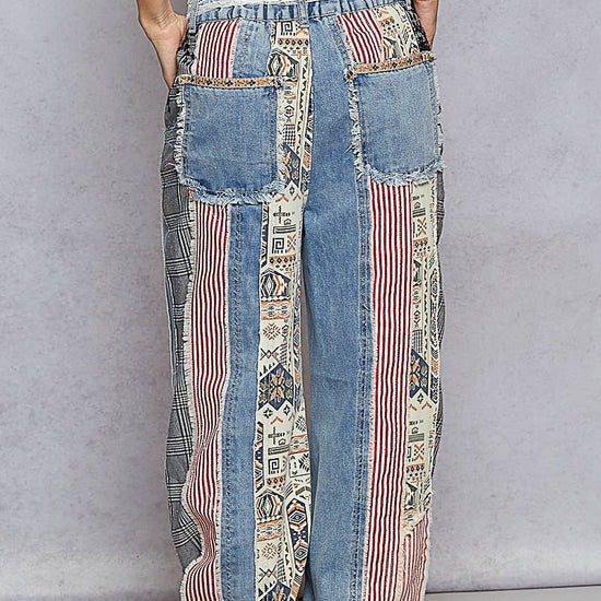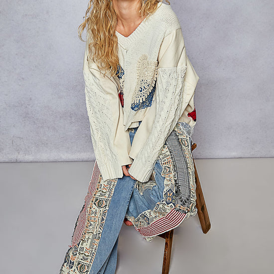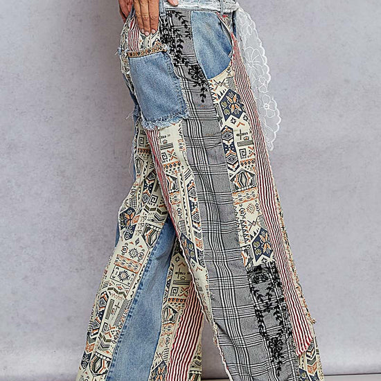 Meet your new statement pair, the Vintage Revival Patch Jeans. Crafted from 100% cotton for breathable comfort, these jeans blend soft denim panels with tapestry-inspired patchwork for that perfectly lived-in, feminine finish. The flowy, wide-leg silhouette and vintage detailing bring effortless boho charm, creating a look that feels both timeless and artfully unique, the kind you'll reach for again and again.